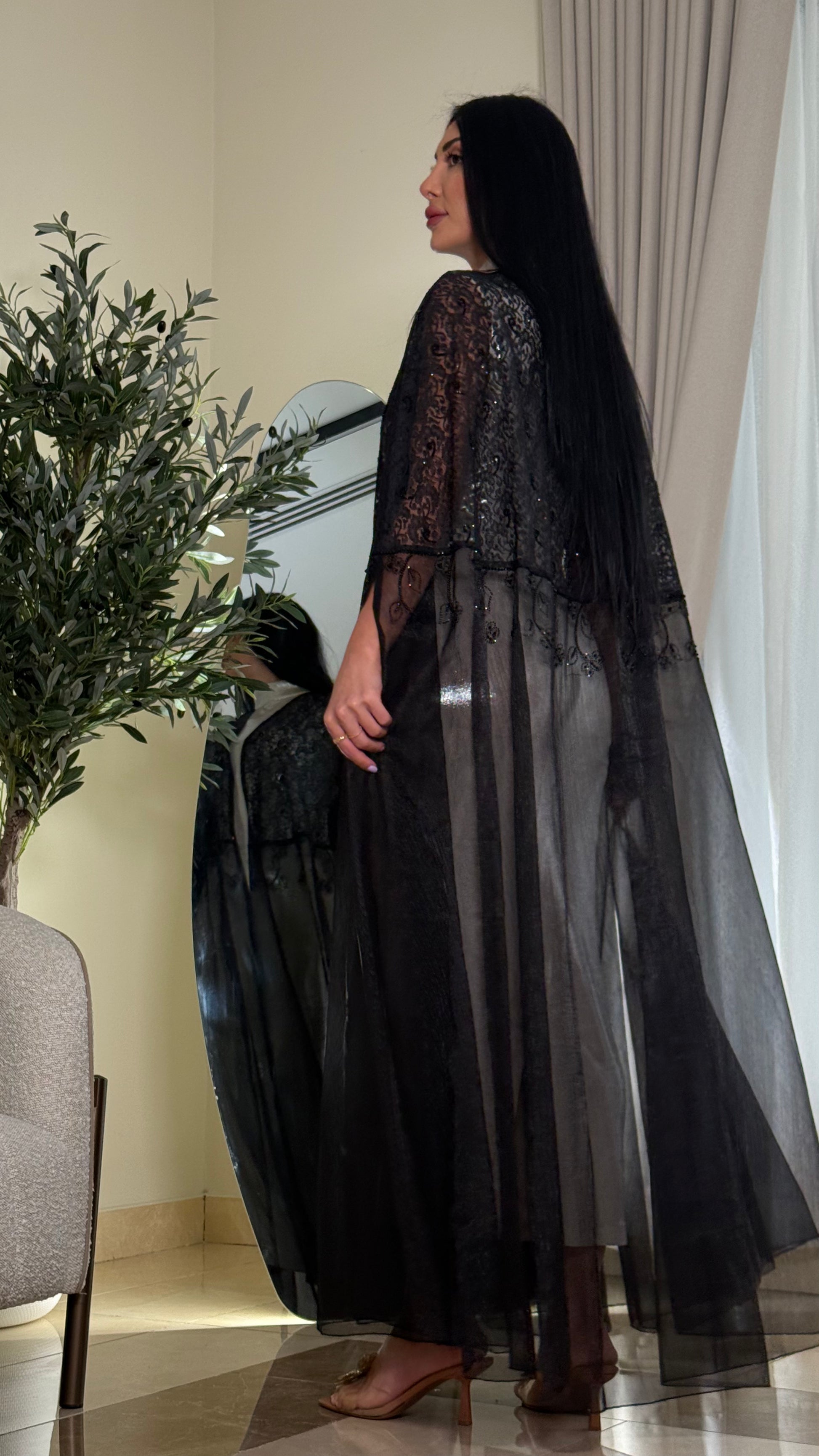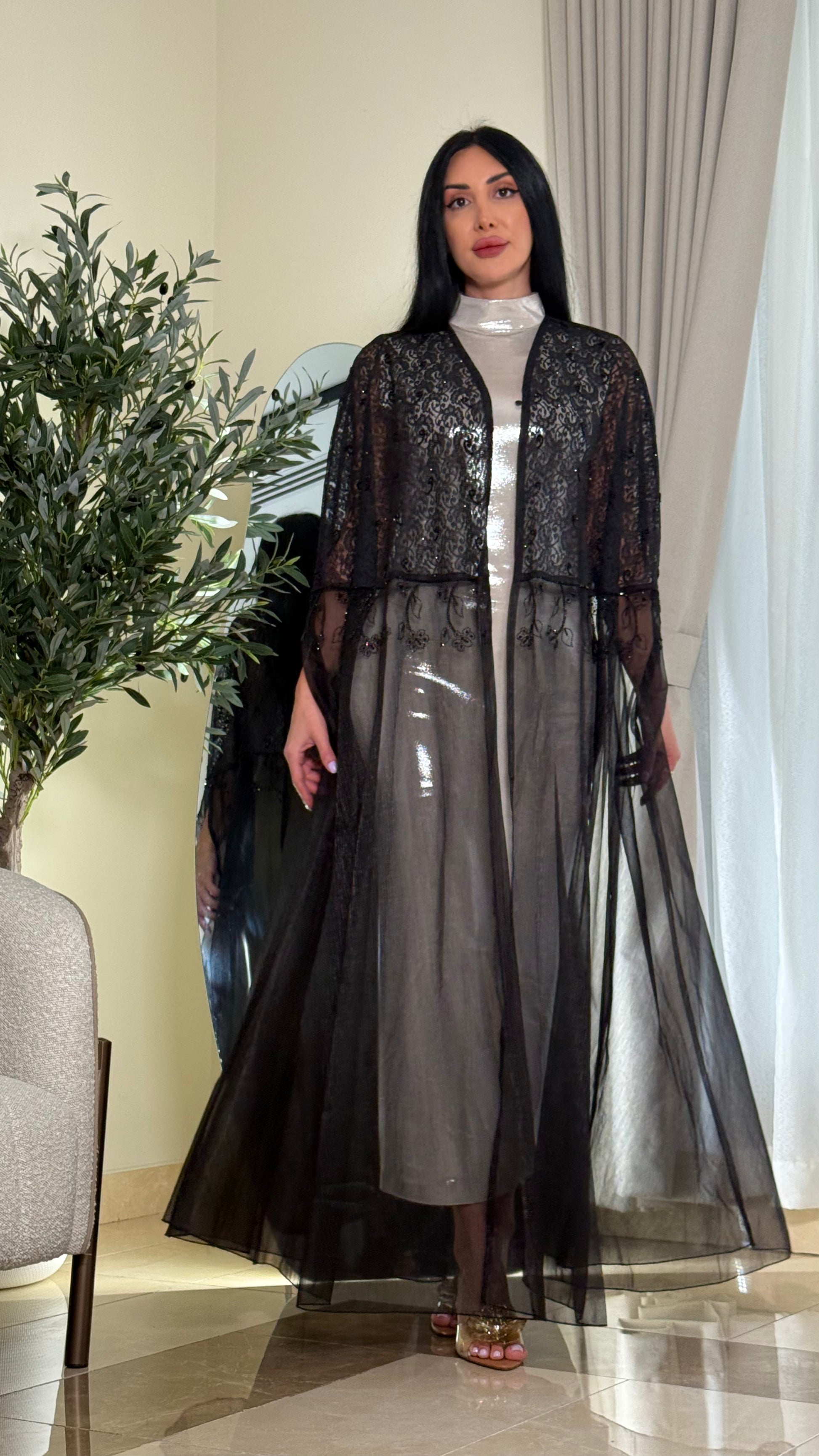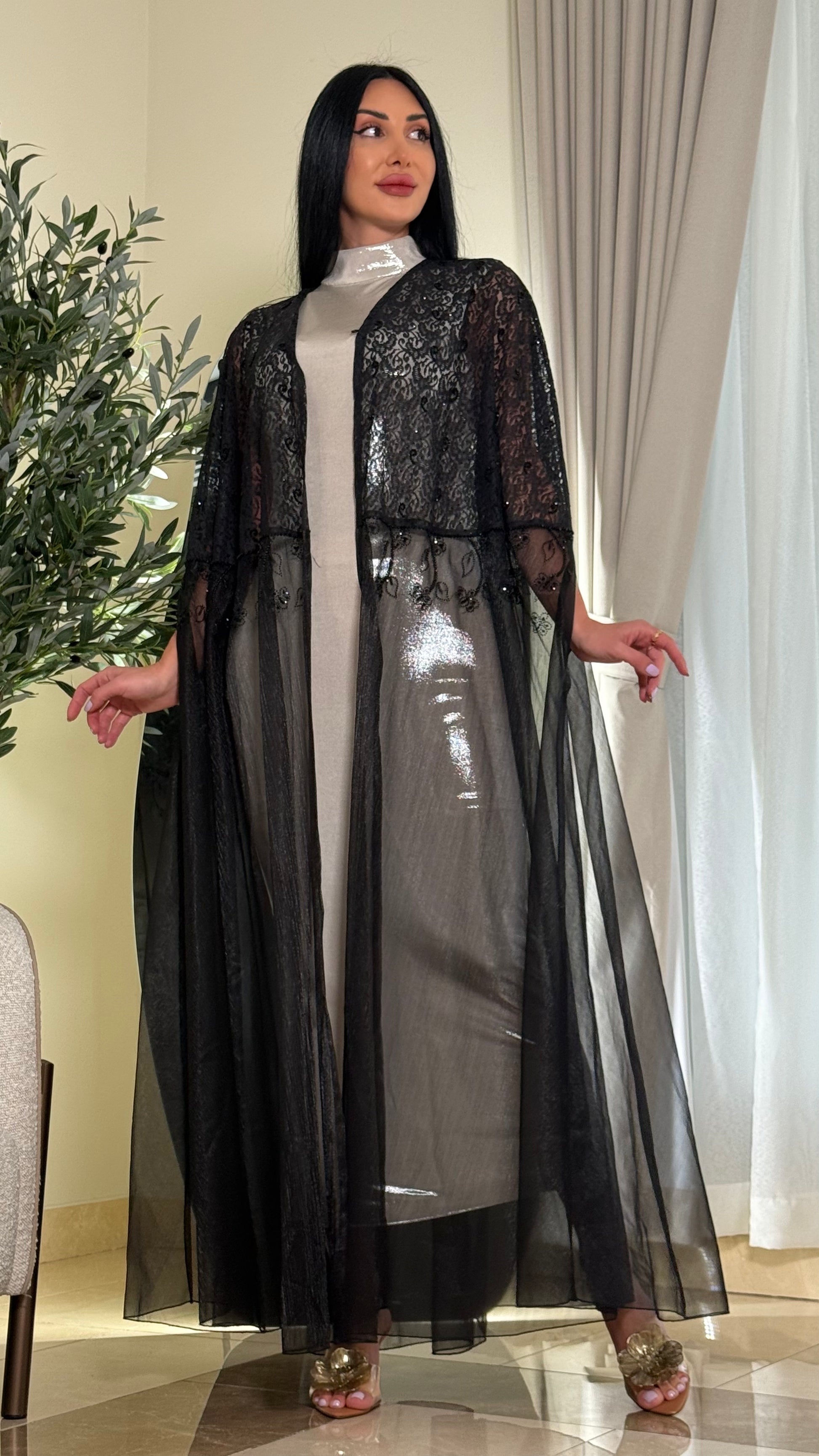 The set consists of an abaya, a dress, and scarf.